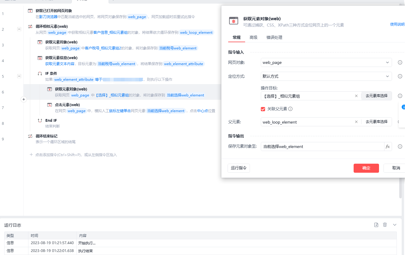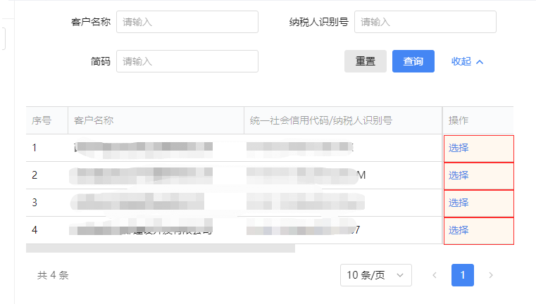 要在网页找到指定客户的税号后,鼠标点击对应的【选择】按钮,但是流程运行完了就是没点,我觉得把选择都关联父元素没有问题,但是不知道为啥没找到选择按钮,大神帮看下这是咋办好?