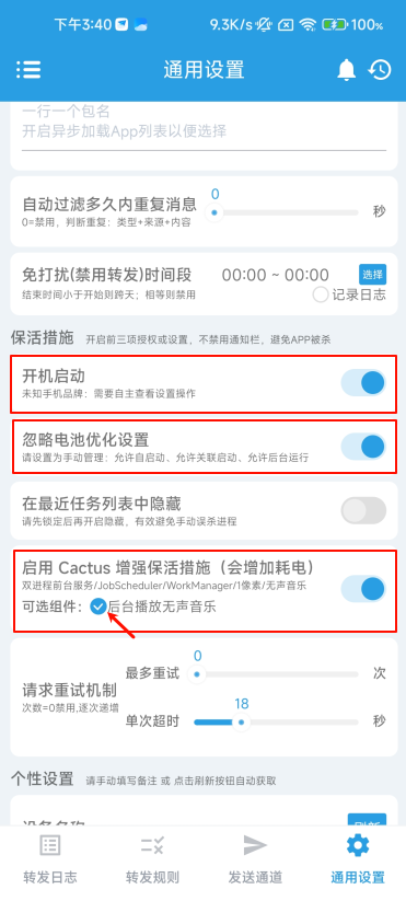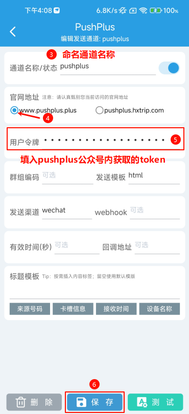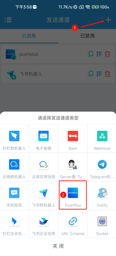 2. 打开短信转发器,点击发送通道,配置pushplus推送