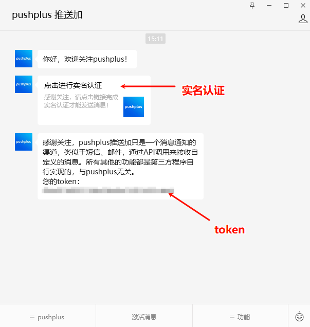 1. 关注pushplus推送加微信公众号,获取token并完成实名认证。