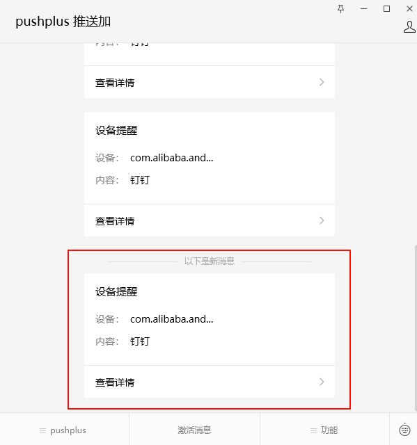 通过SmsForwarder短信转发器,通过匹配APP包名将钉钉消息用pushplus(iOS有Bark、鸿蒙Next有MeoW)推送到微信或其他设备中,理论上可支持任意的APP消息通知推送到任意IM系统或者自建网站,只需要有webhook推送服务即可。通过此方法,可实现多设备通知信息的统一和监控,比如: