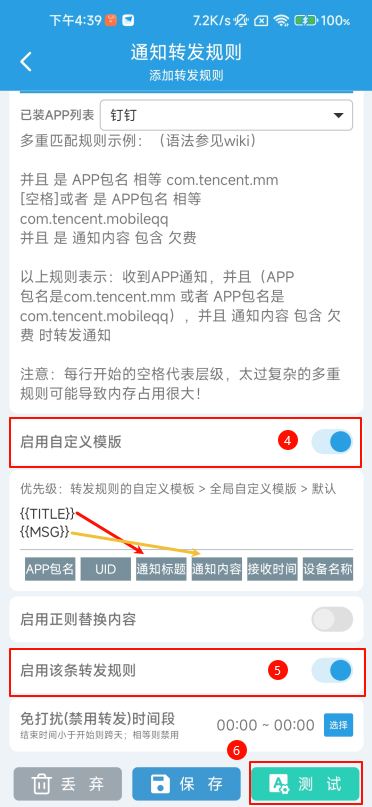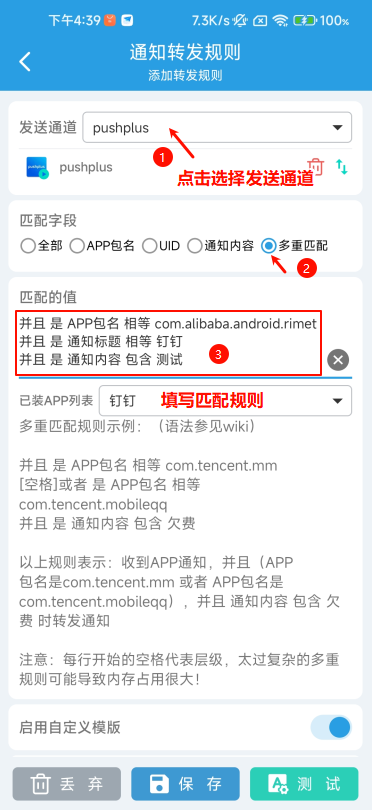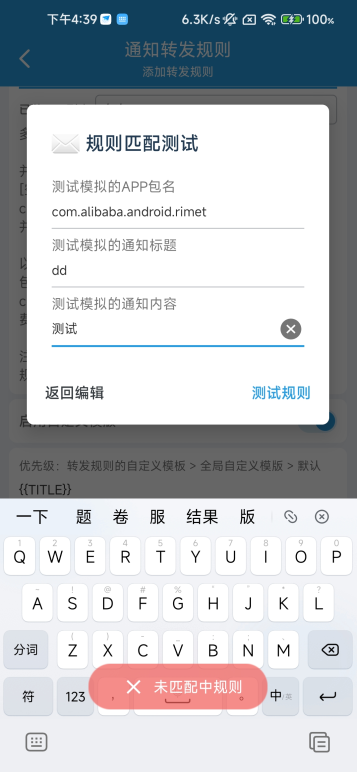 4. 按流程配置完成后,可以点击测试,将app包名、通知标题、通知内容填入后点击测试规则,测试pushplus能否正常接收app转发消息,如填写的内容不符合匹配规则,会显示未匹配中规则。反之能正常推送。
