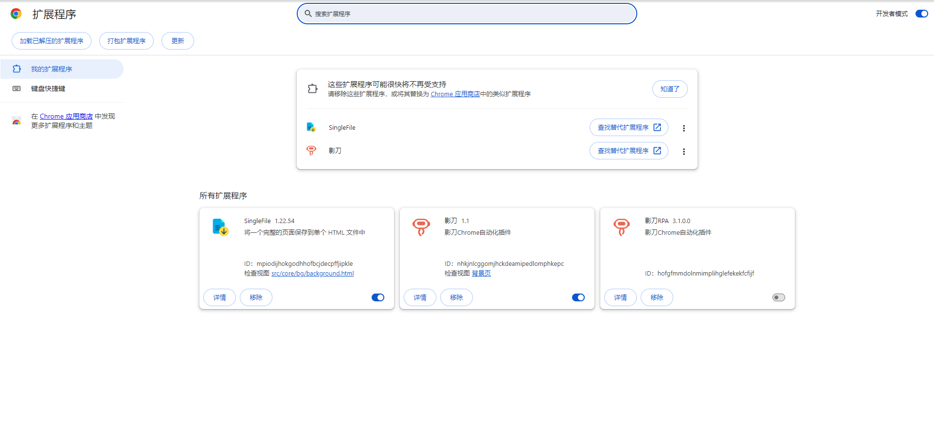 由于 “影刀”1.1 插件(别名影刀V2 插件)是基于 MV2 标准开发的 Chrome 扩展,在Chrome 130 及之后版本,Chrome 官方开始灰度禁用 MV2 拓展,导致我们影刀V2插件也将无法使用,所以请大家尽早升级使用 “影刀RPA”(影刀V3 插件)。