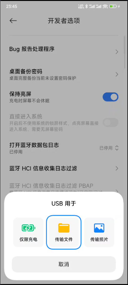 1. PC和手机连接数据线,选择 传输文件