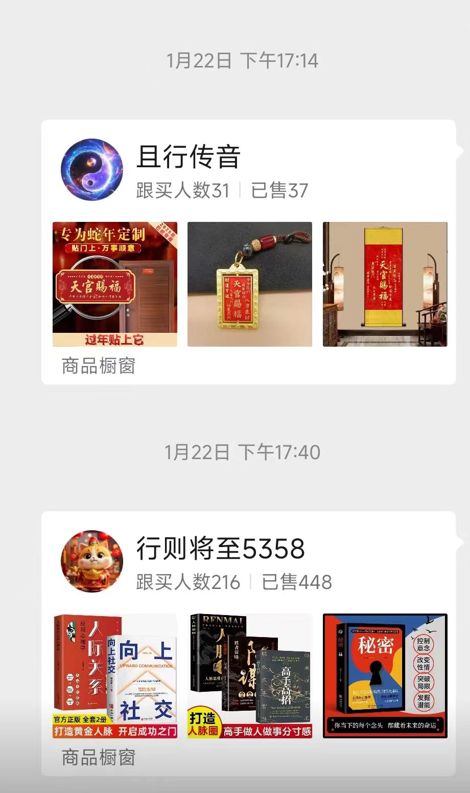 以下是手机端刷到的视频号账号,进入商品橱窗后,发送到微信群里,用手动方式记入表格中(已售数据),效率低下。