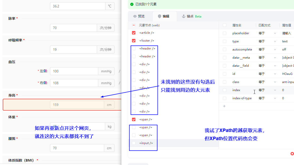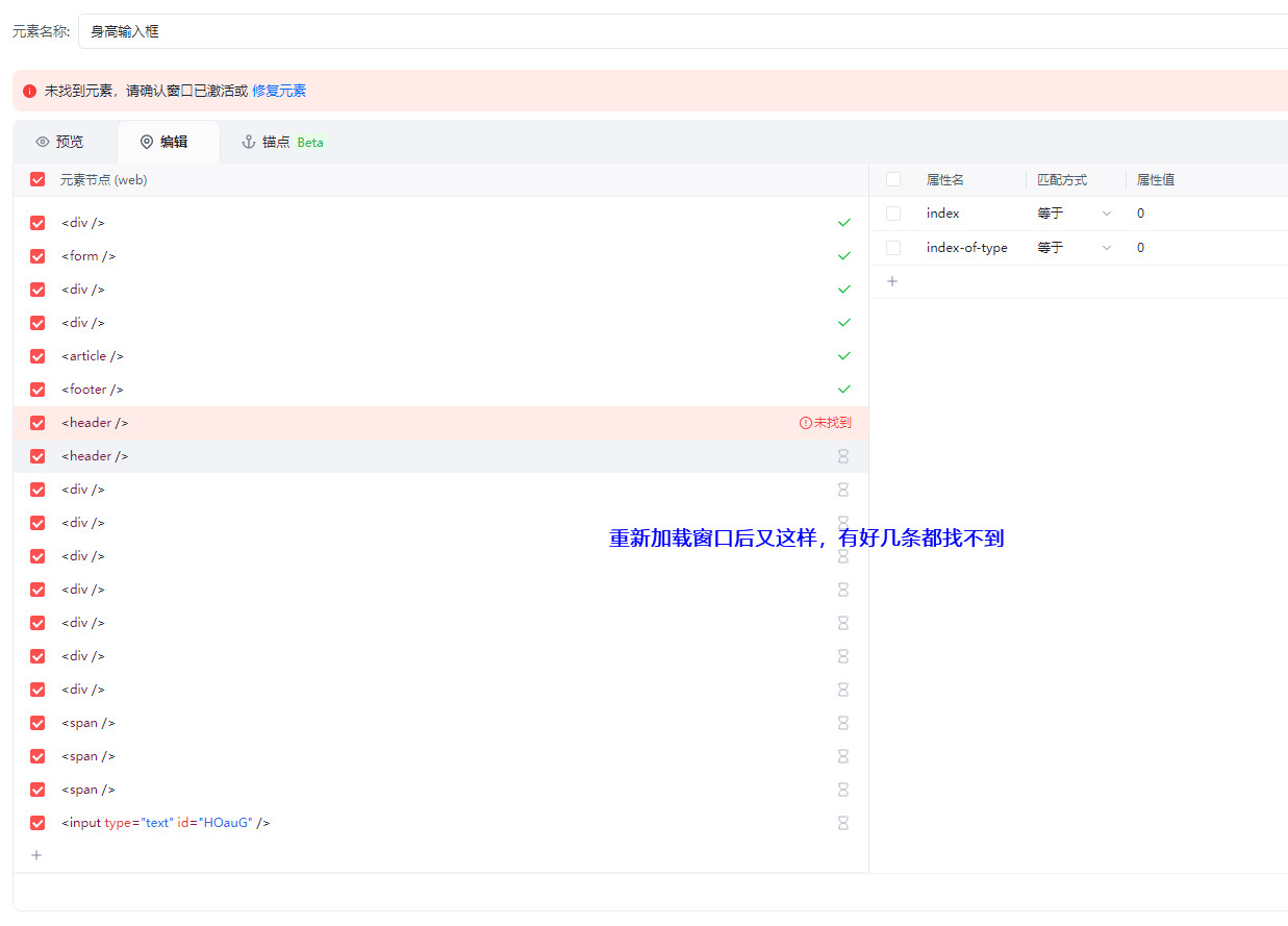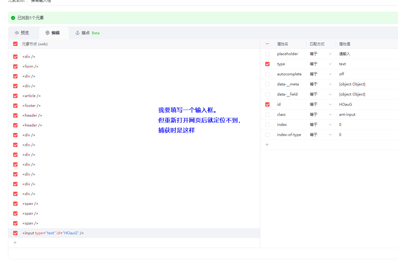输入框第一次捕获时正常,关掉网页窗口后再次点开同样的窗口就不能找到输入框,点击修复也提示修复失败。添加描点也不行,跨越XPath获取也不行。