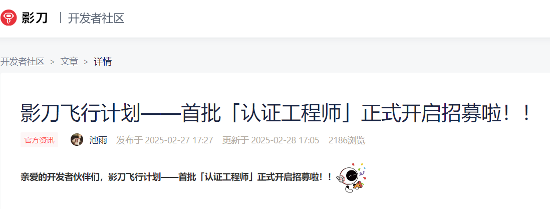 2025年2月27日,由池雨在社区发布了官方资讯(影刀飞行伙伴计划),截止本文撰写日期2025年3月14日,已有2186浏览,10人完成影刀伙伴计划考核。