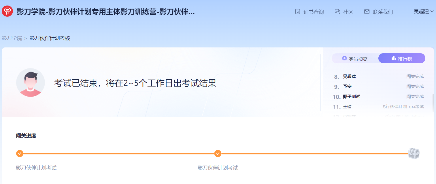 •如认为自己已经完全掌握相应的知识点,可以主动提出进行笔试,笔试的方式为登录影刀学院,进行考试(与影刀学院的证书考试方式相同)
