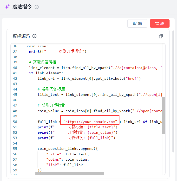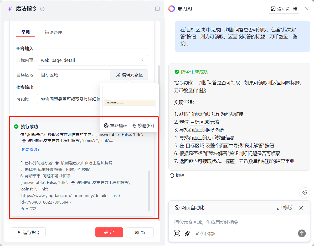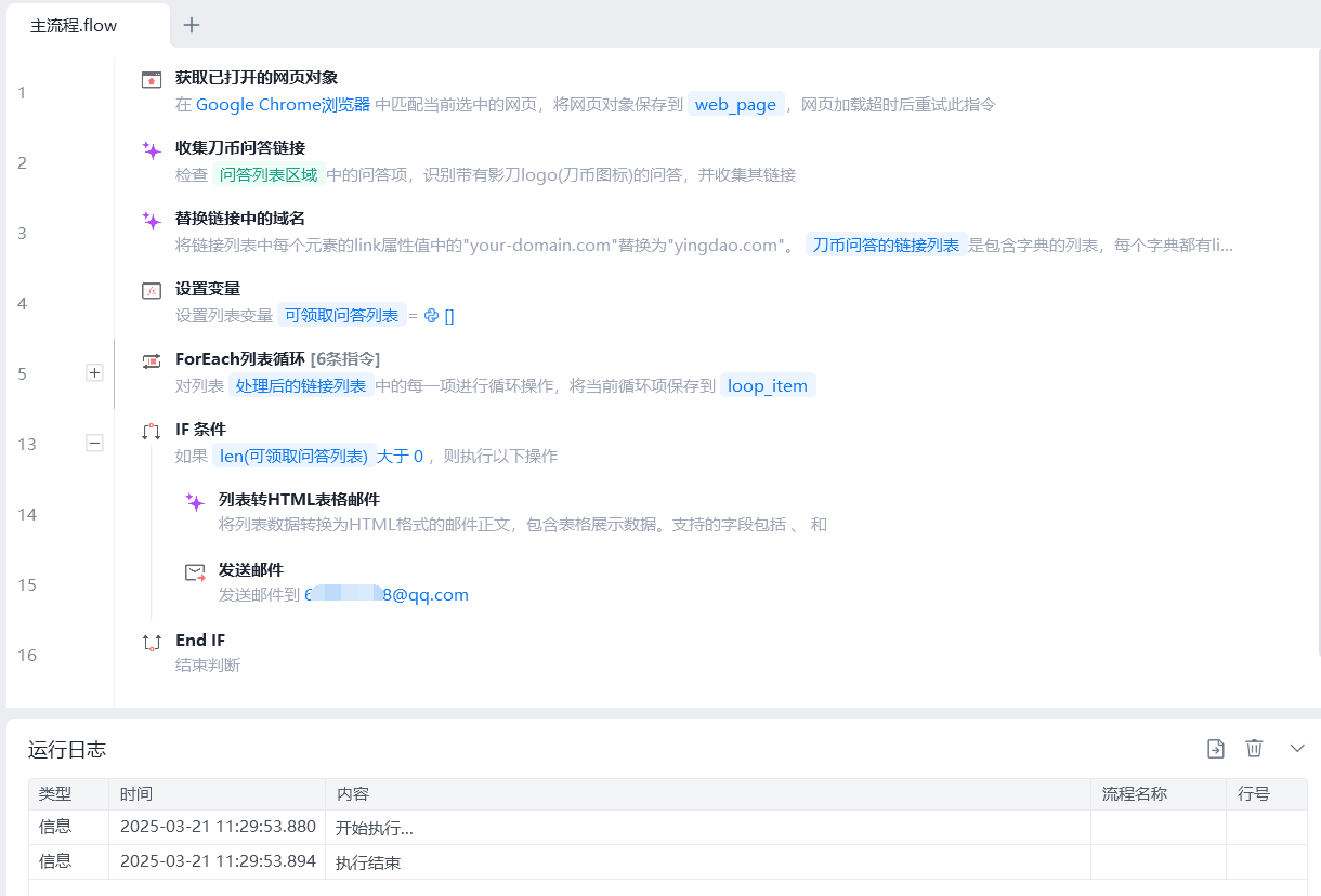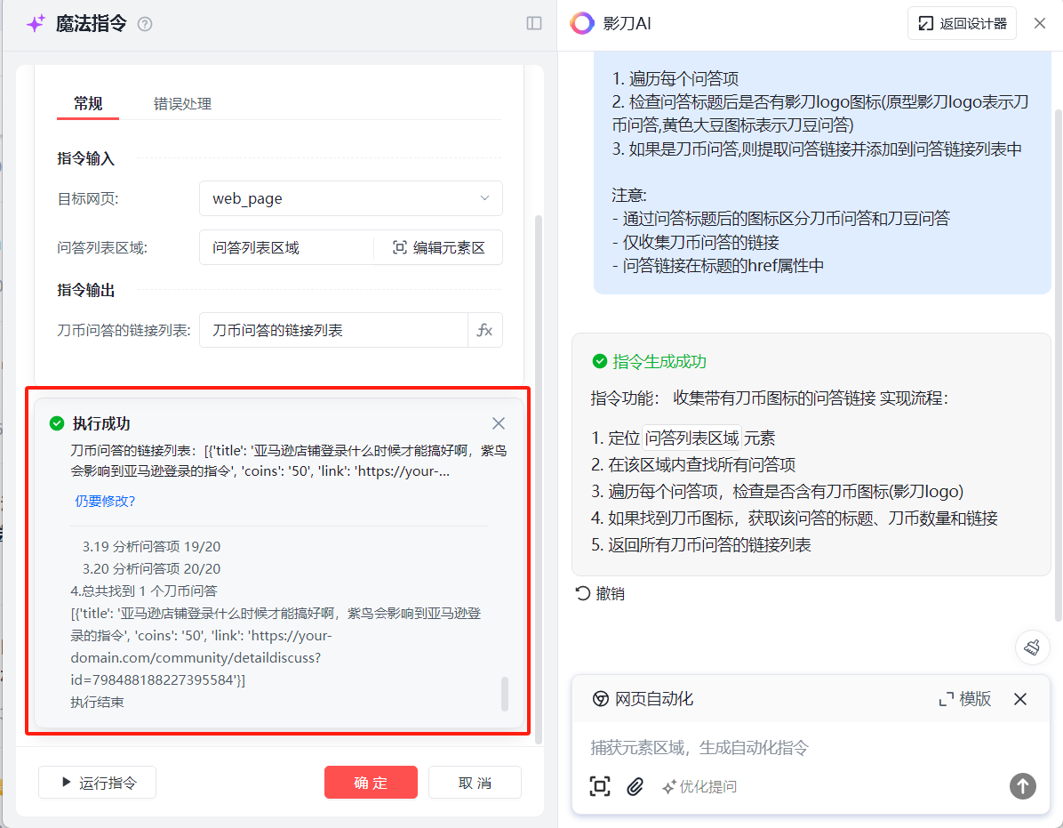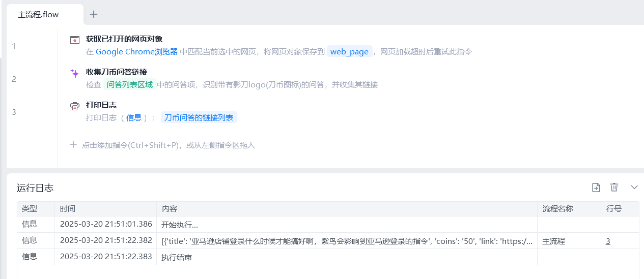 在影刀代码区我们执行魔法指令,看看效果,刀币问答的链接列表,能够正常获取。