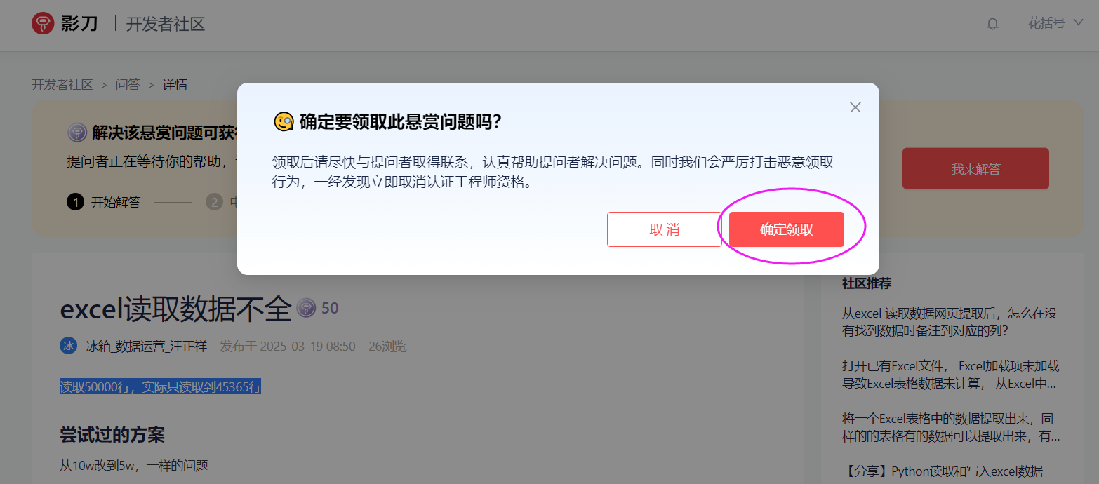 如果问答还未被领取,在右侧会显示我来解答的按钮,点击确定领取即可领取问答,其他人不再能领取。