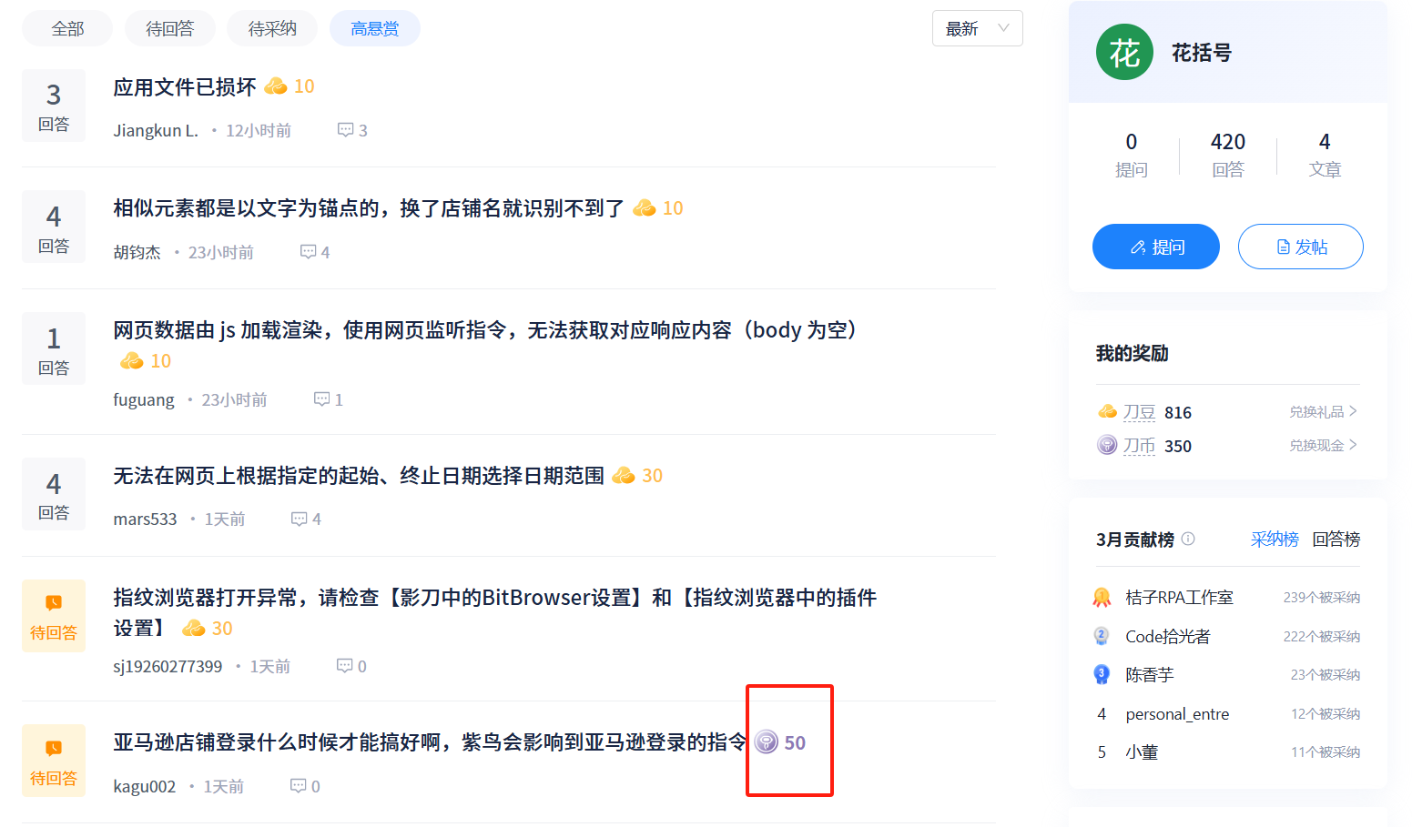 进入影刀社区,点击问答里的高悬赏,下图红色框选的银色银币标记的问答,就是刀币问答。10刀币=1元人民币,可以直接兑换现金。
