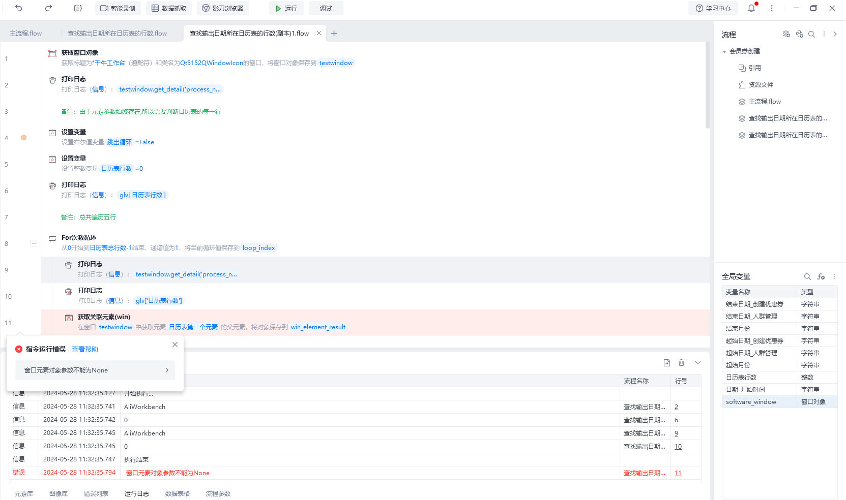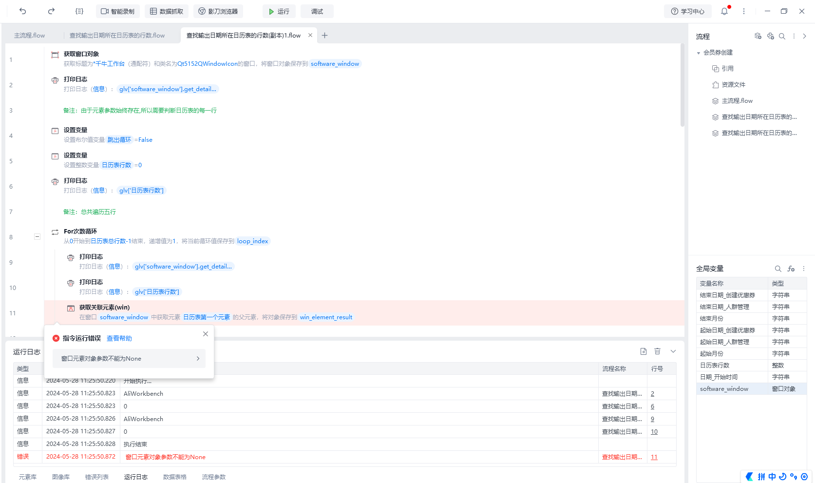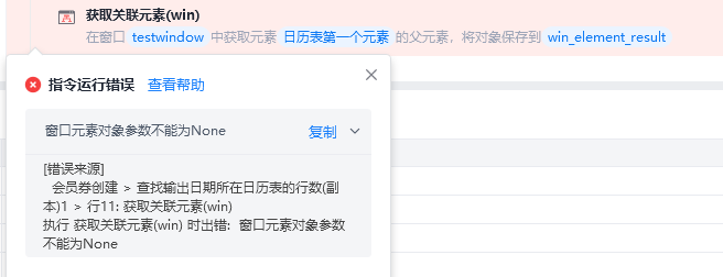 如图,流程中获取窗口元素对象,打印日志不为空;在获取元素信息之前打印窗口元素对象仍然不为空。但执行获取关联元素(win)指令时报错提示窗口元素对象的参数为None。我有一个同名全局变量为None,但更换窗口元素对象的变量名称后,仍然报错提示参数为None