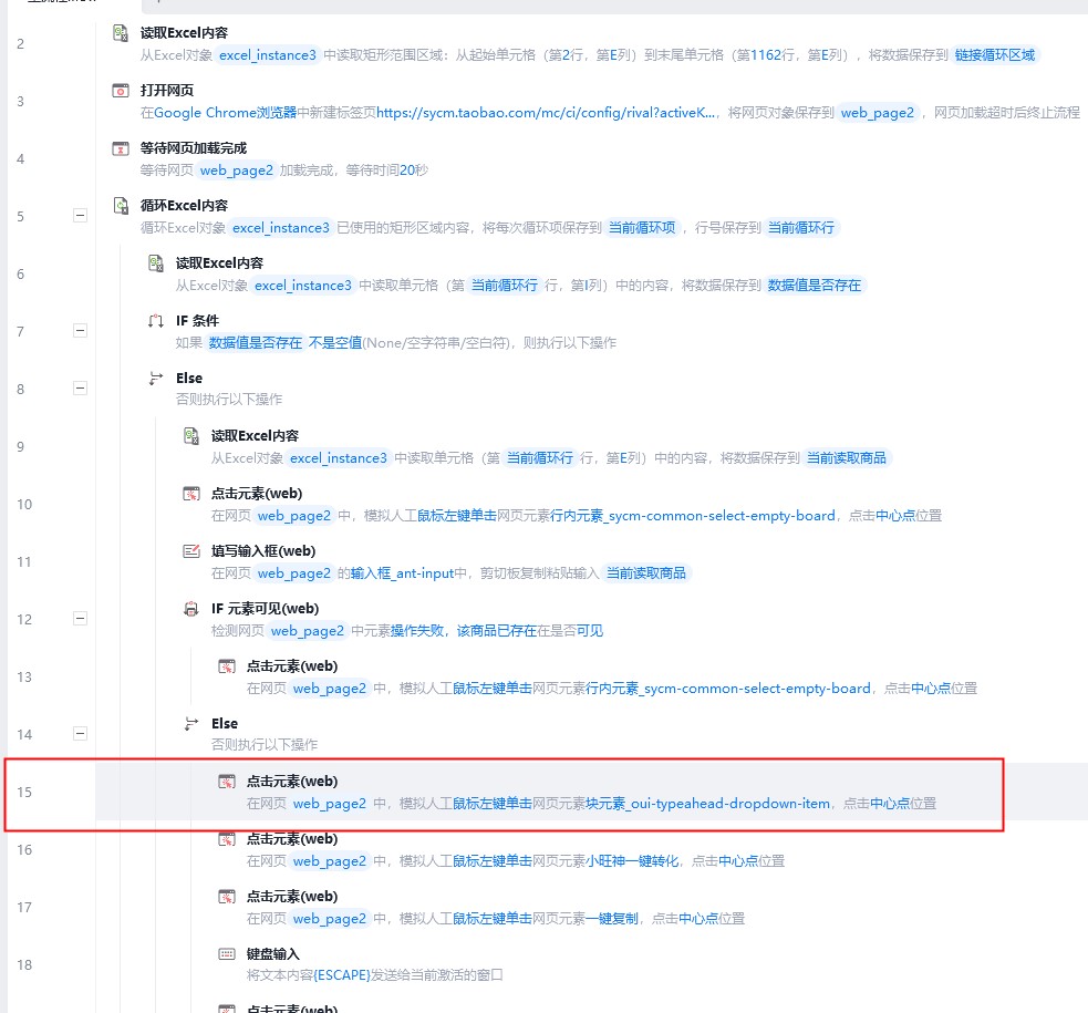 就是我这设置了一个循环EXCEL+网页的自动化,从对应的EXCEL搜索指定的关键词,然后再根据搜索结果抓取对应的数据填入到EXCEL表格里,起初一切都很正常,但是大概循环个2-30次的时候,就会出现“不会按搜索”,就是第15的步骤出现问题,然后就一直循环9-11这个步骤,而重新启动程序就又可以了;