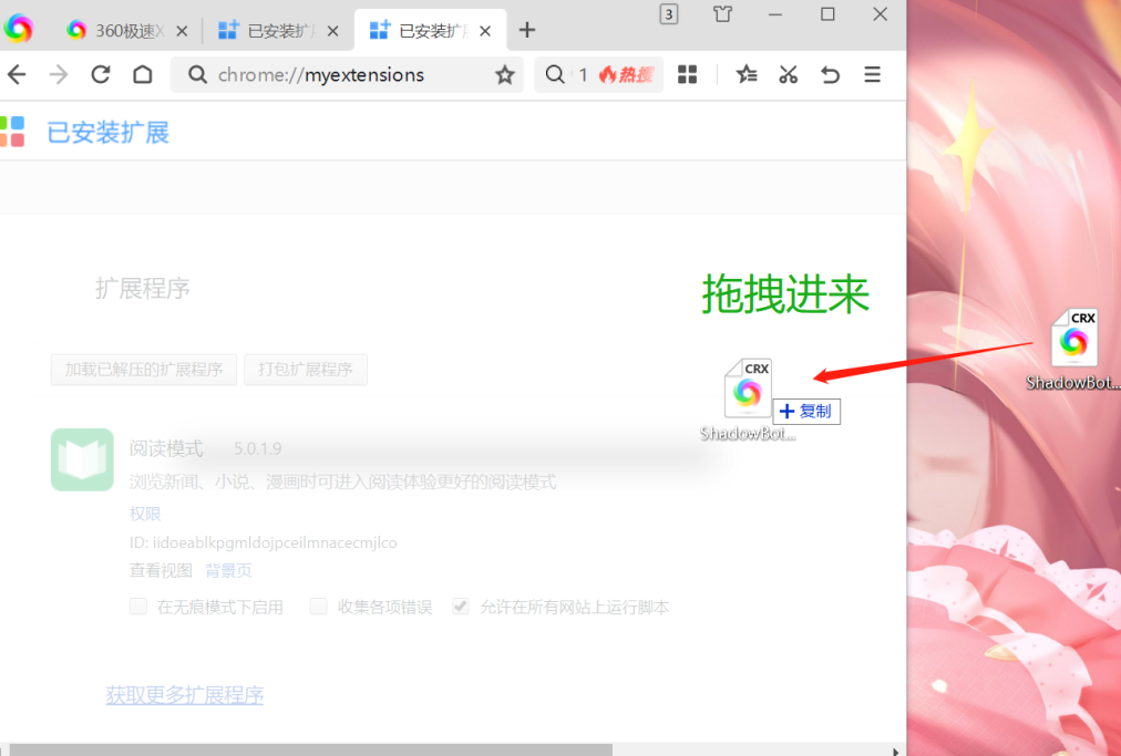 第二步:开启开发者模式,拖动插件到扩展程序页面来安装;
