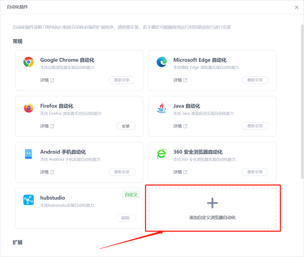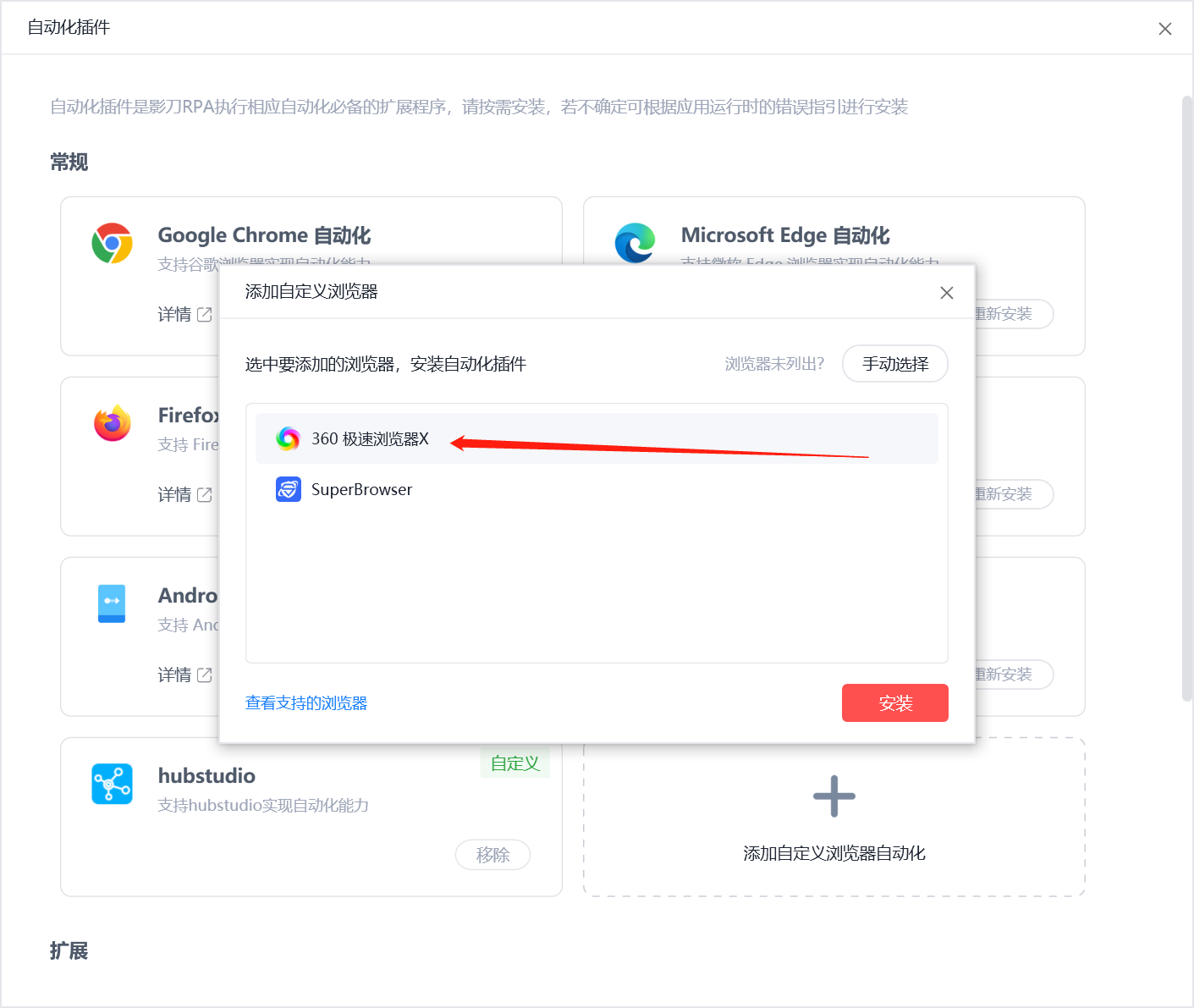 在我们安装自动化插件安装时,我们想要安装360极速浏览器X时,发现这个浏览器不属于常规浏览器,所以我们安装此浏览器的插件的时候,需要去添加自定义浏览器自动化插件安装插件: