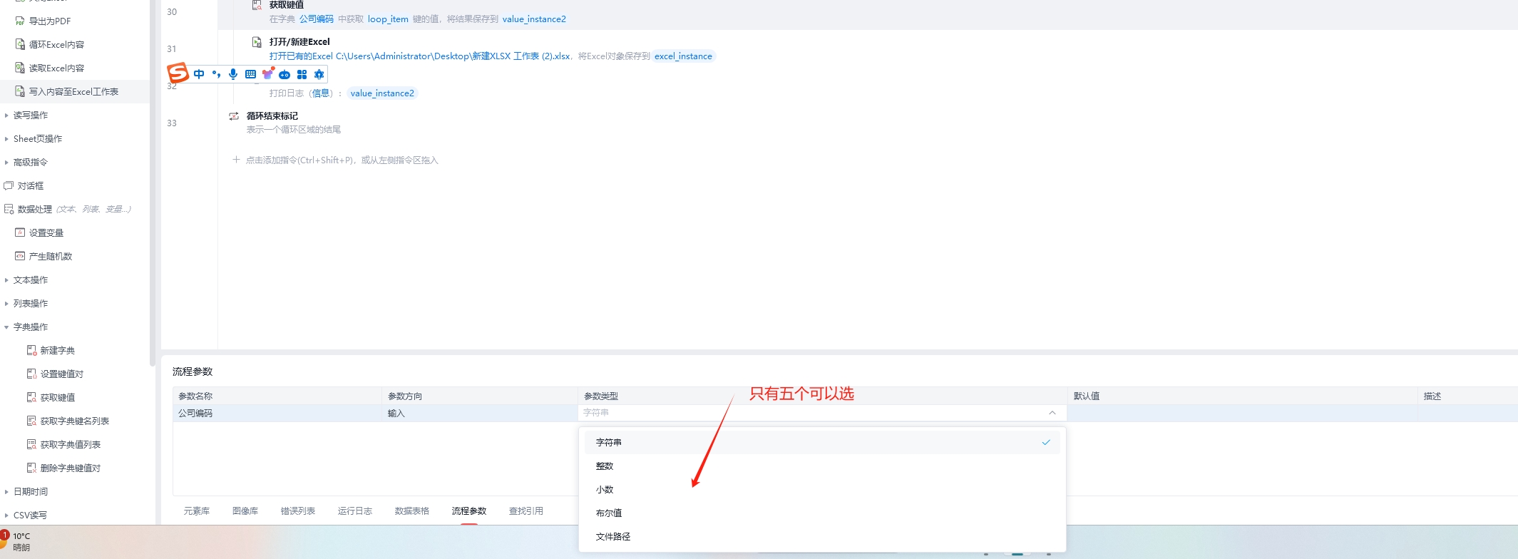 请问我为什么可以在子流程中新建一个字典参数,但是在主流程却没有字典类型的参数让我新增【已解决】