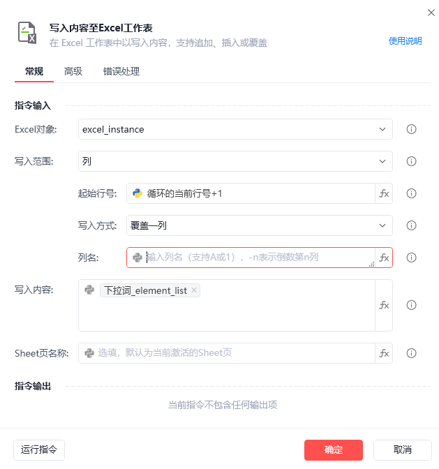 应用场景:我想批量抓取某词在电商平台的搜索下拉词,通过运行应用已知获取的下拉词列表没问题,但是卡在回写excel这一步。因为在写入内容到excel表里这一步,行是动态的,但是列怎么设置成动态的呢?我希望最后呈现的表格效果如图1所示。