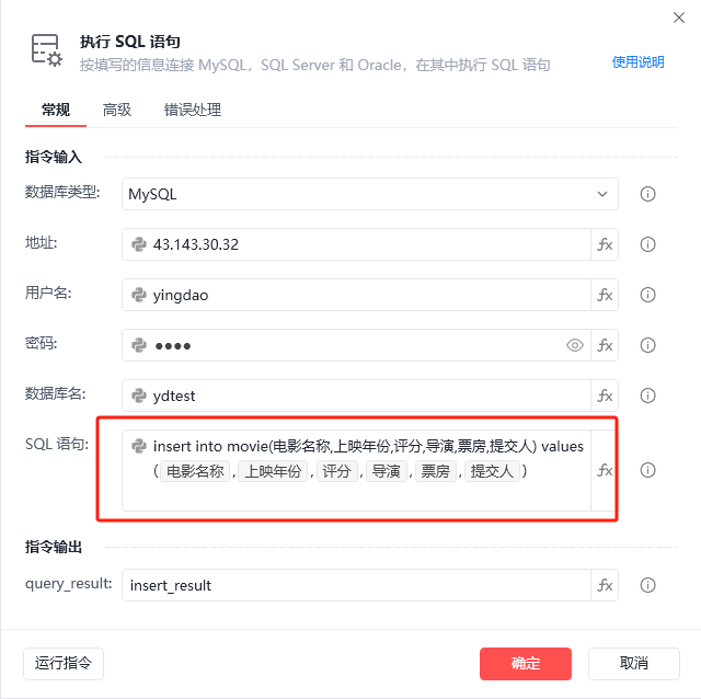 要求如下:1. 数据库信息:IP:`43.143.30.32` 端口号:`3306` 用户名:`yingdao` 密码:`9527` 库名:`ydtest` 表名:`movie`(注意,该数据库只开放了写入权限,无法查询)