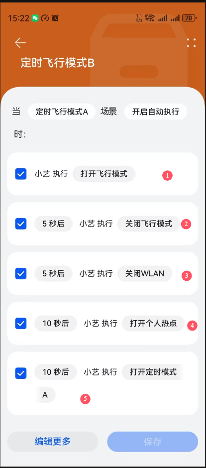 场景“定时飞行模式B”的触发条件是“定时飞行模式A”场景“开启自动执行”时,执行编号1-5的任务,见截图6的信息。