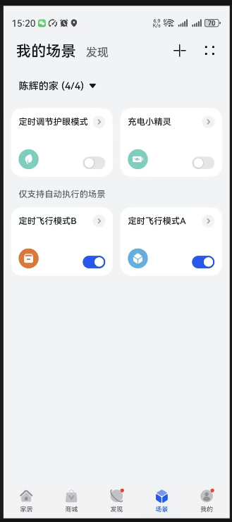 我做了2个场景“定时飞行模式A”与“定时飞行模式B”,都是自动启动状态,见截图4的信息。