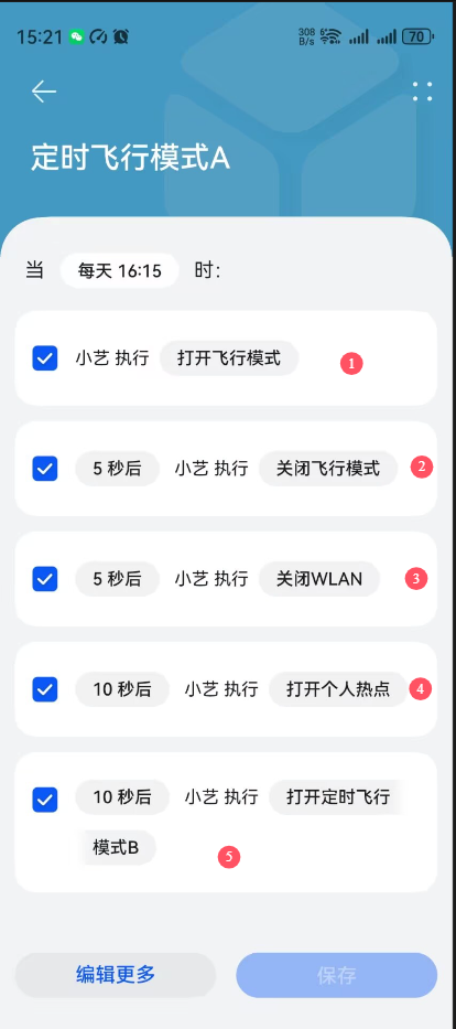 场景“定时飞行模式A”的触发条件是“每天16:15”时,执行编号1-5的任务,见截图5的信息。