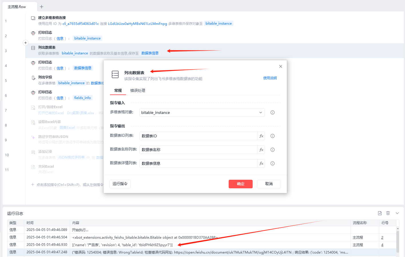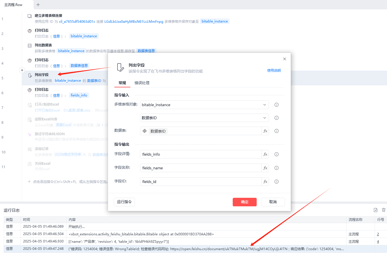 ("错误码: 1254004; 错误信息: WrongTableId; 检查错误代码网址: https://open.feishu.cn/document/ukTMukTMukTM/ugjM14COyUjL4ITN ; 响应结果: {'code': 1254004, 'msg': 'WrongTableId', 'error': {'log_id': '20250405014947D918AD3C343430573525', 'troubleshooter': '排查建议查看(Troubleshooting suggestions): https://open.feishu.cn/search?from=openapi&log_id=20250405014947D918AD3C343430573525&code=1254004&method_id=6965347212289409026'}}",)