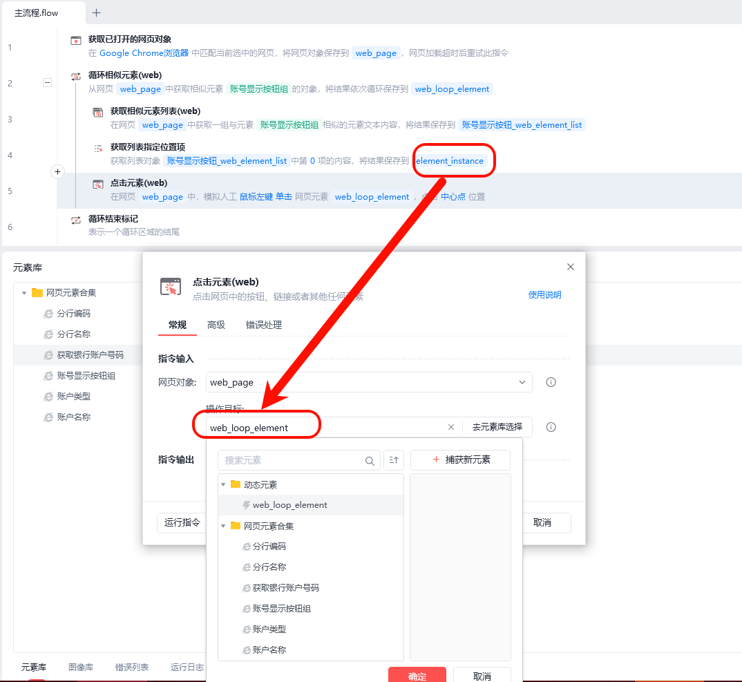 为什么“点击元素”操作目标获取不到“获取列表指定位置”的变量?