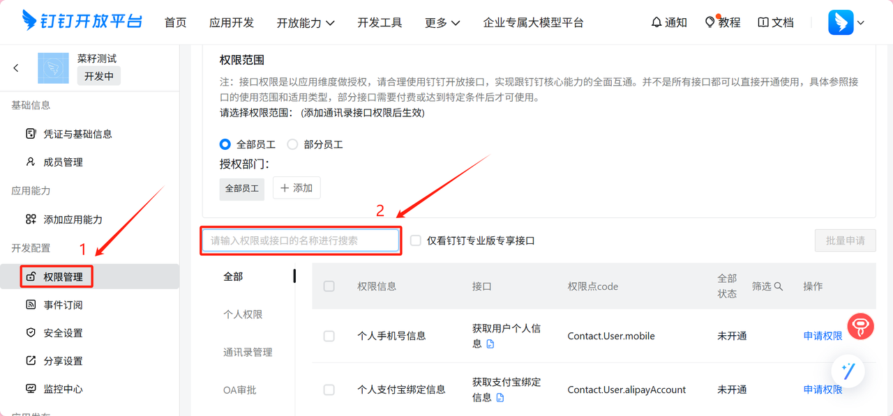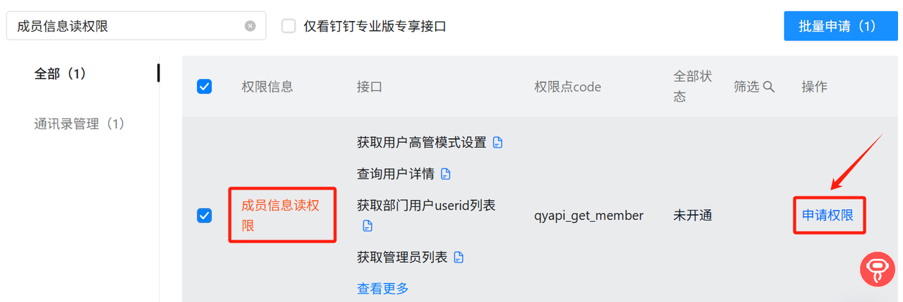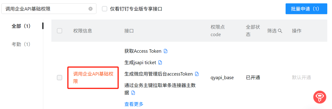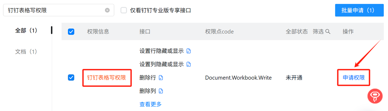 需开放的权限为:成员信息读权限, 调用企业API基础权限, 钉钉表格读权限, 钉钉表格写权限