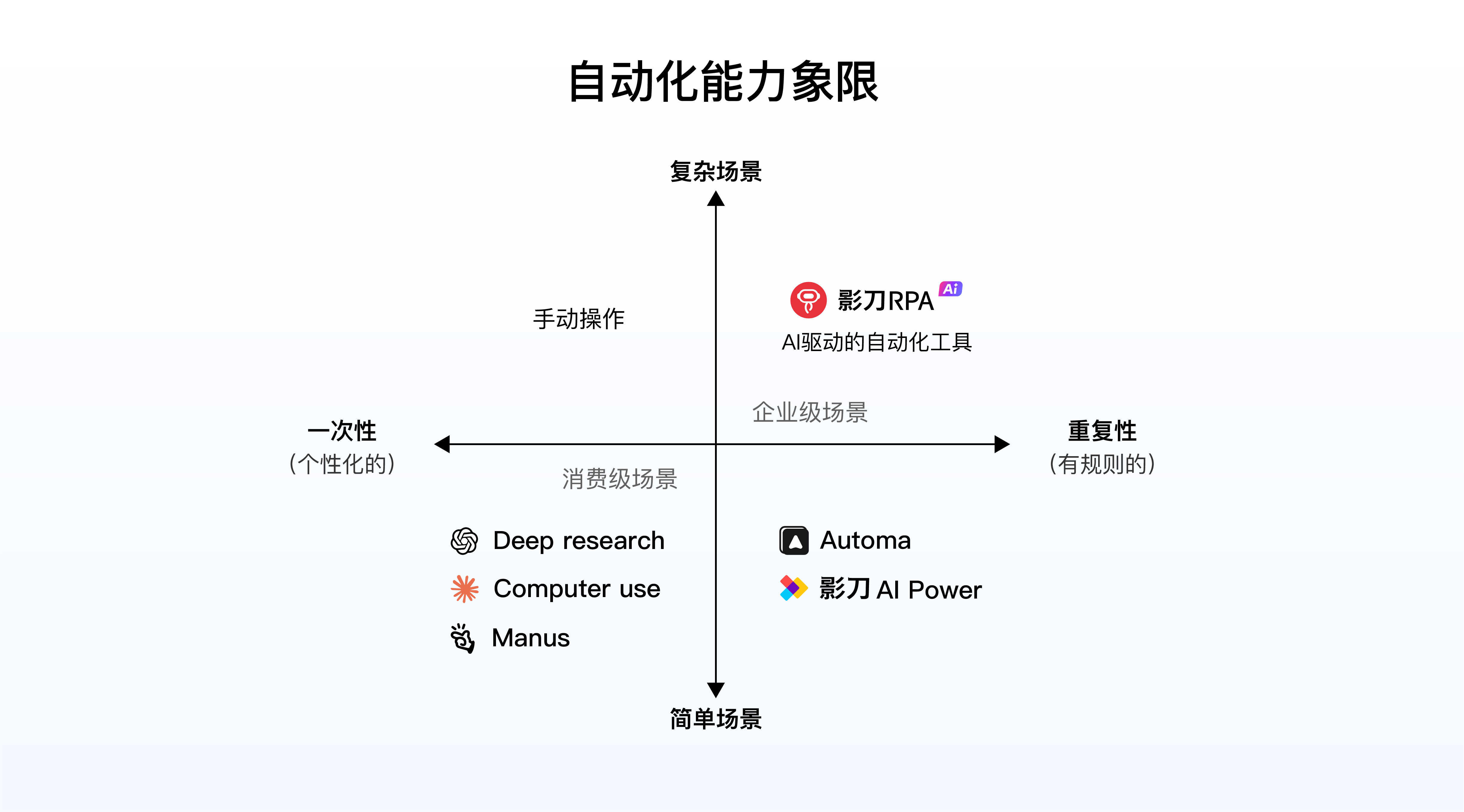 “在自动化能力四象限中,对于消费级场景,用户关注的是智能性,希望AI来代替我完成决策;对于企业级场景,用户关注的是可靠性,你可以不做但是不能做错。”