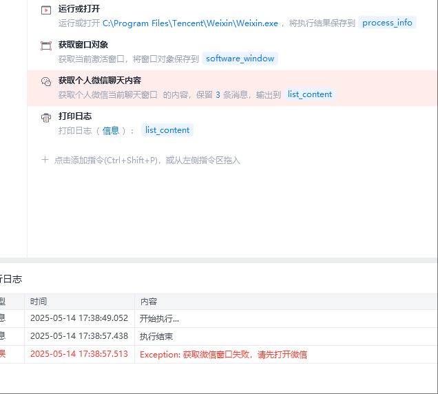 执行 raise Exception("获取微信窗口失败,请先打开微信") 时出错: Exception: 获取微信窗口失败,请先打开微信