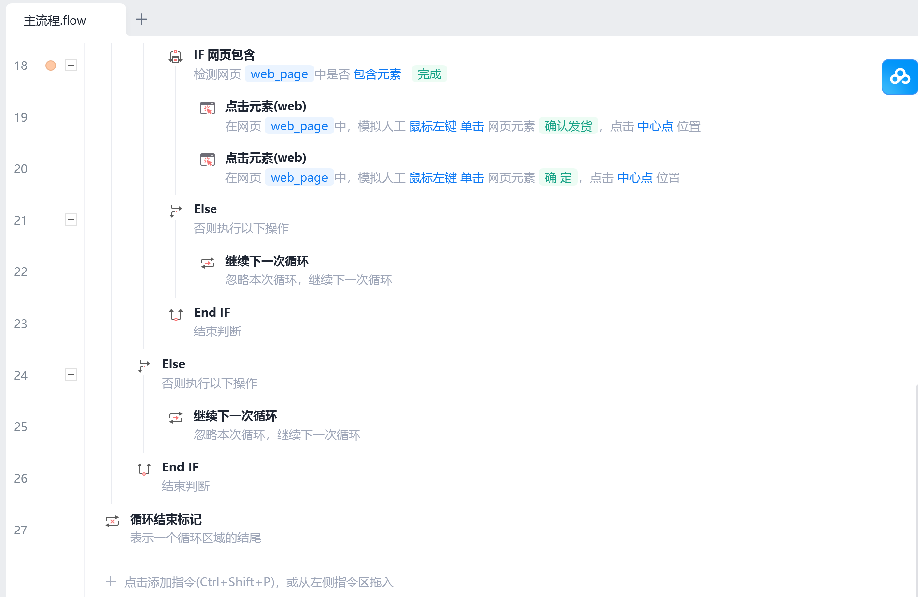 初级-网页自动化-闯关练习题2,设计完成后,仅第一次按要求完成搜索订单,判断商品名称和状态,符合状态后点击”确认发货“和”确认“。继续搜索后符合判定条件的订单,程序不再执行点击”确认发货“和”确认“,程序自动循环一下项了,不知道是哪里出了问题,该如何改正?