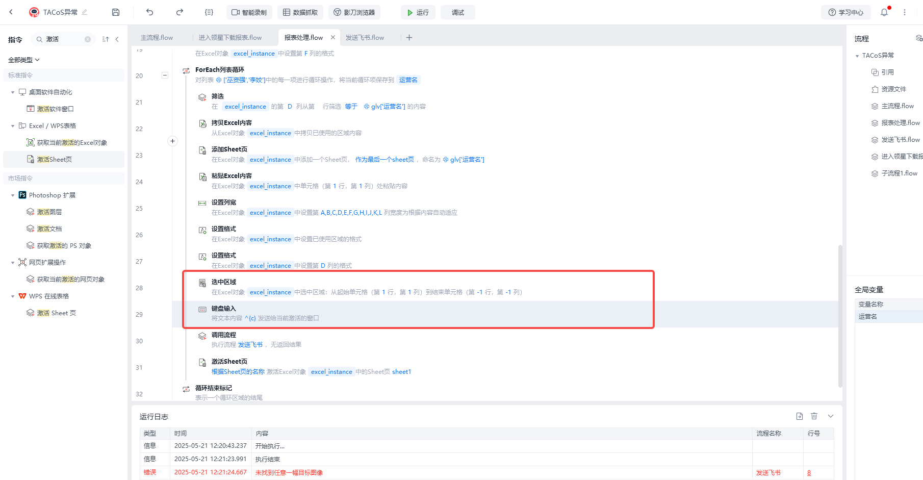 将excel表中的数据复制到飞书中以图片方式发送,第一个循环可以复制表格中的数据并发送成功,但是第二个循环可以选中区域,但是无法进行ctrl+c的复制操作