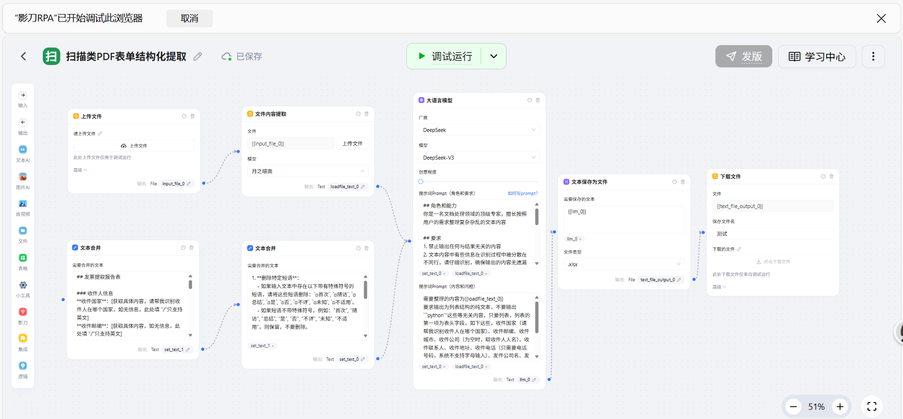 我在ai power上搭建好pdf发票自动化提取并保存为excel,但是在rpa里面要怎么搭建这个循环体,怎么循环上传pdf,怎么把识别完后的excel,保存到,桌面指定文件夹?