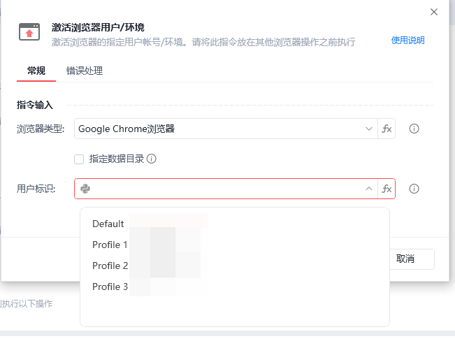 3.弹出一个下拉选项对话框,每个选项内容为各不同chrome用户窗口对应的用户昵称(是昵称不是profile-directory属性的值),选择一个选项后,输出结果为这个对应的profile-directory属性的值,保存为变量(对话框下拉选项非固定,选项数量应为此刻已经打开的Chrome多用户窗口数量,选项文本为不同用户昵称,不包括未打开的);