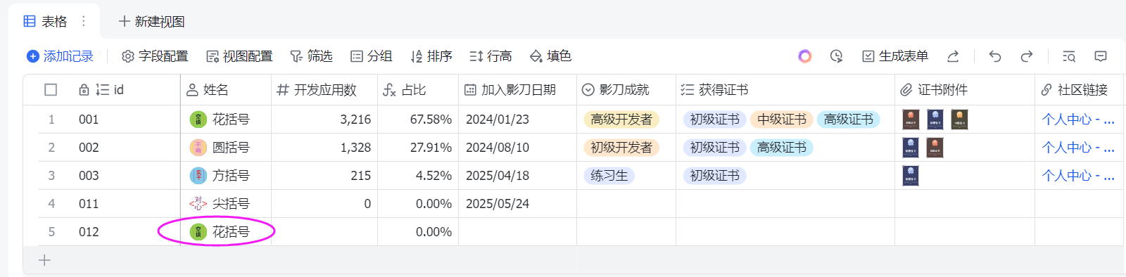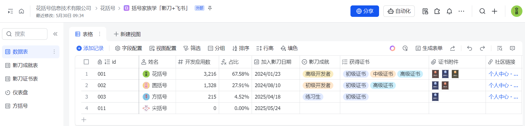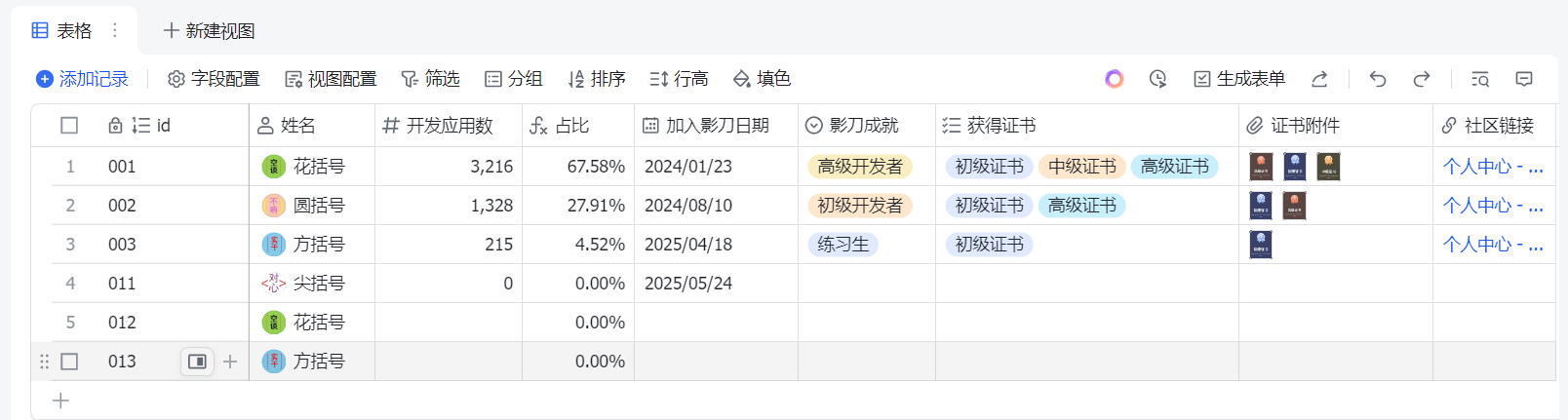 ['id', '姓名', '开发应用数', '占比', '加入影刀日期', '影刀成就', '获得证书', '证书附件', '社区链接']