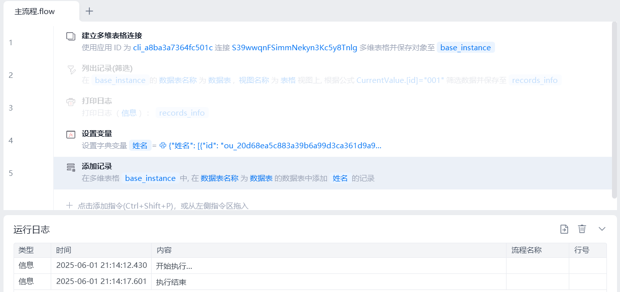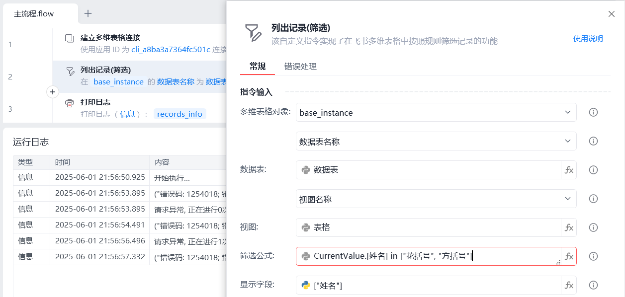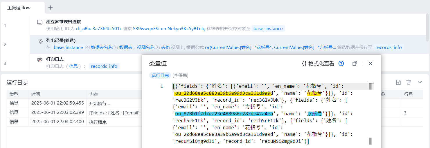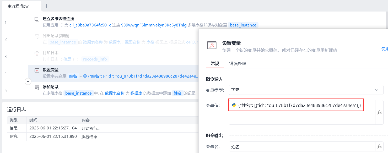 更改变量“姓名”的id值,执行流程,添加“方括号”成功。