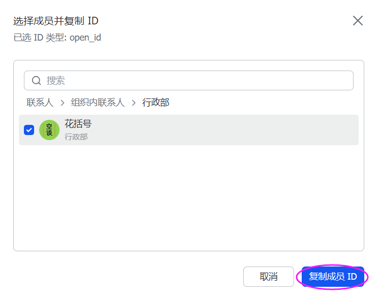 4.在弹窗中,搜索或选择指定用户,并点击 复制成员 ID,获取用户的 open_id。