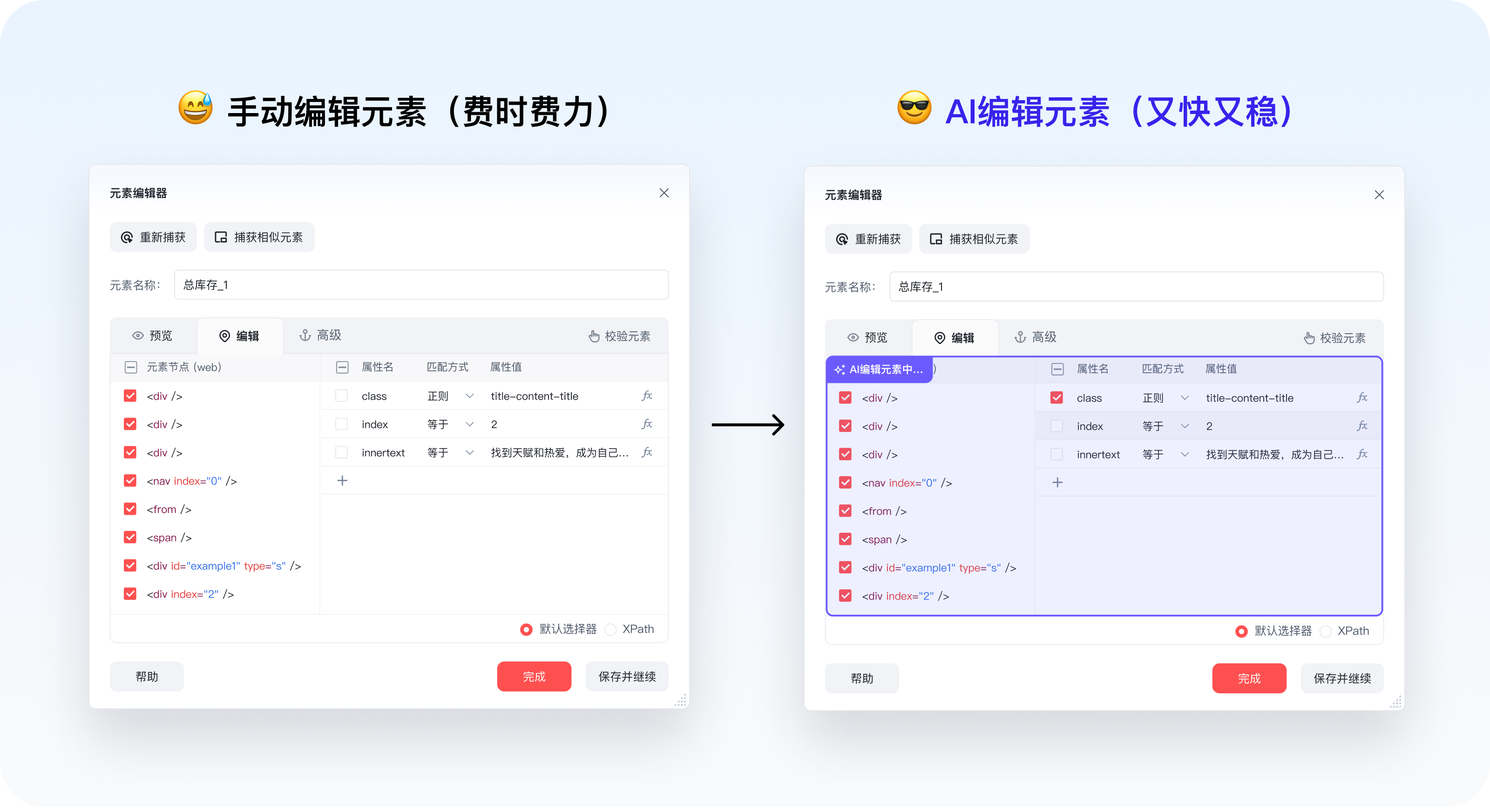 我们在新版本中推出了「智能元素」,现在你在捕获元素时,AI会根据对网页内容结构的理解,精选出更稳定的节点、属性,并同时生成Xpath路径。这会大大提升操作效率与稳定性。