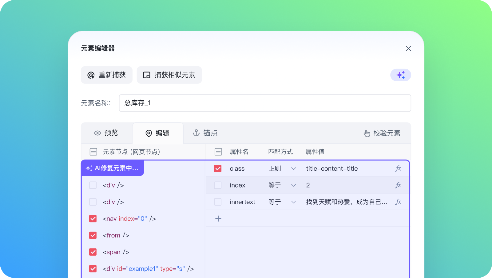 需要开启「AI优化元素」功能(在 设置-设计器-捕获元素时使用AI优化元素 中开启),开启后,当你在捕获元素时,AI会根据对网页内容结构的理解,智能精选出更稳定的节点、属性,从而生成一个更稳定可用的元素。(由于该功能消耗量较大,仅支持企业版用户无限次使用,个人用户每周限运行30次)