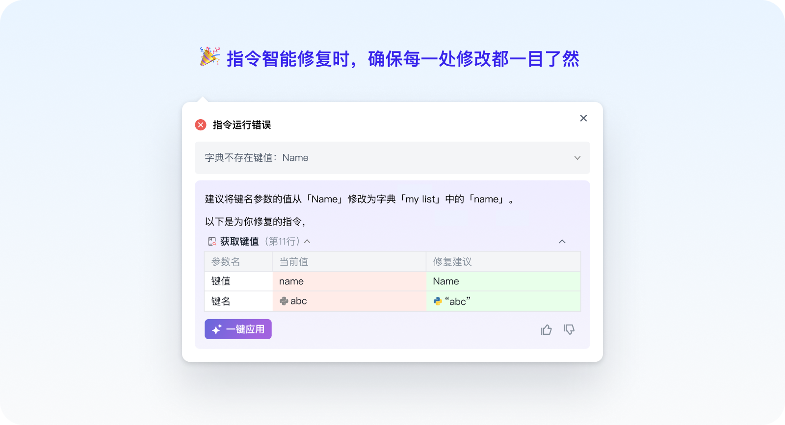 在流程出错时,影刀通过AI诊断错误信息并提供一键修复,功能上线后获得了良好反馈。但我们发现长文本的修复结果展示不够简洁,可能影响你对修复情况的理解。为更清晰地传达变化,我们采用列表方式对比修复前后的结果,确保每一处修改都能一目了然。
