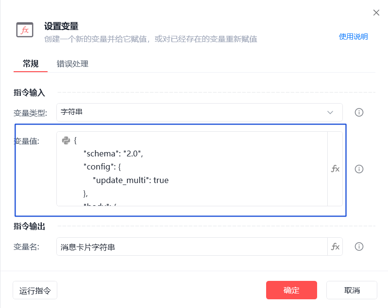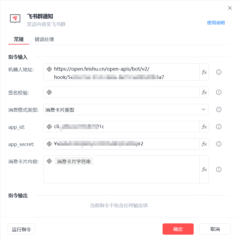 消息卡片类型:消息卡片是飞书独有的消息格式,可以通过飞书官方提供的飞书消息卡片搭建工具进行编辑消息卡片,完成编辑后可以将内容粘贴到「消息卡片内容」中,即可发送消息卡片。