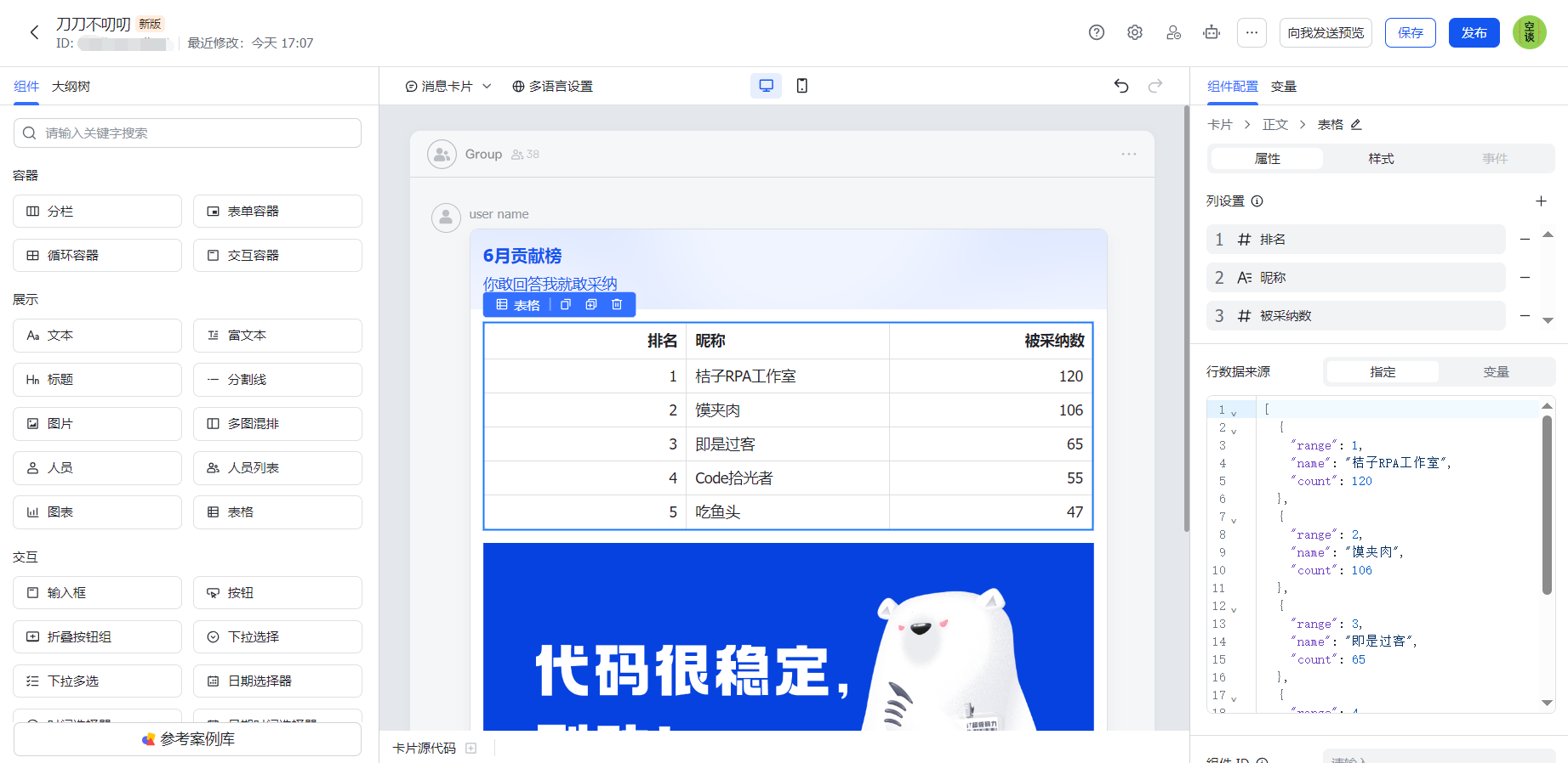 拖拽组件到展示区,编辑相关内容即可完成卡片的制作。