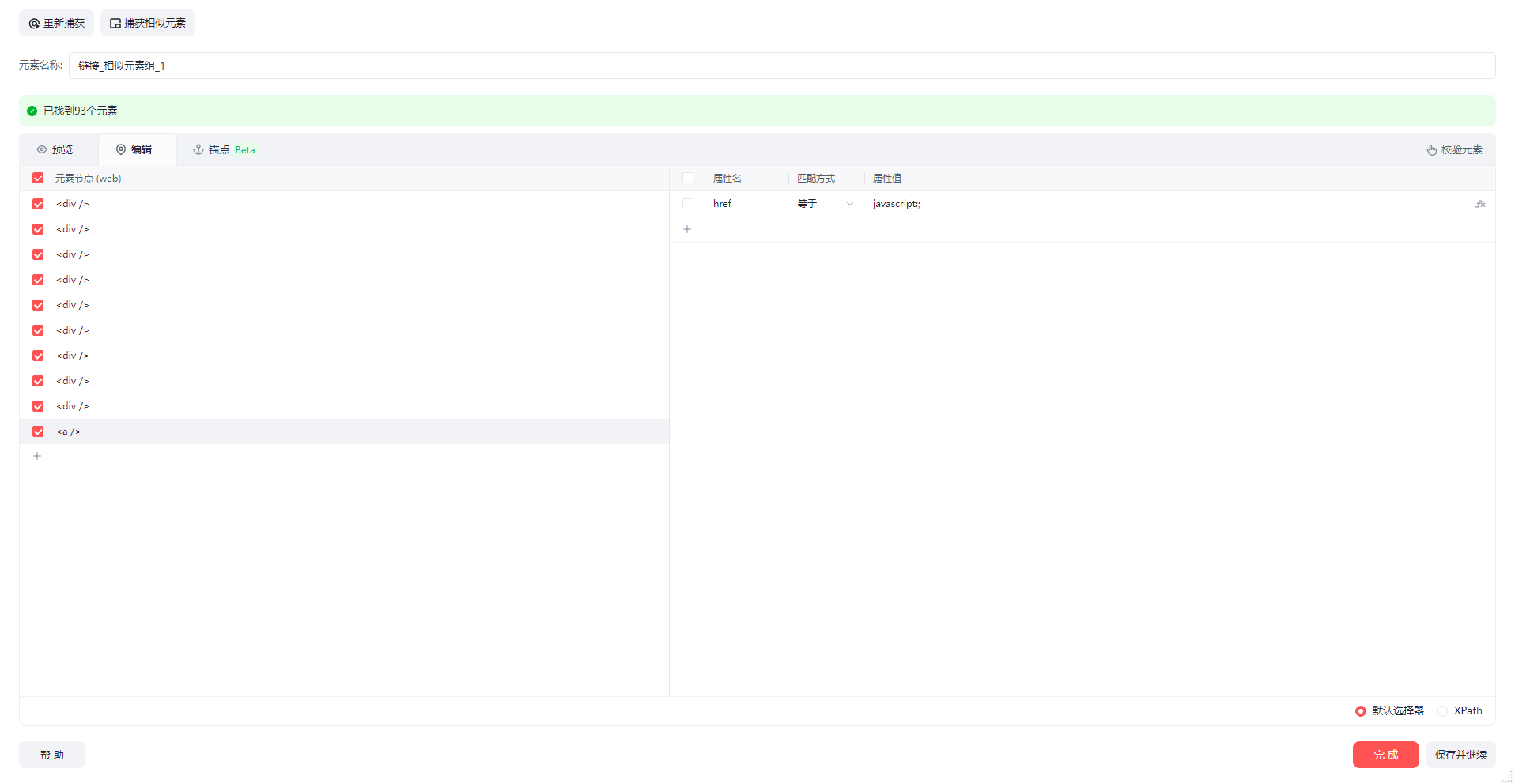 然后再使用捕获相似元素,捕获到了90多个元素,其中右侧收藏等元素是不需要的。