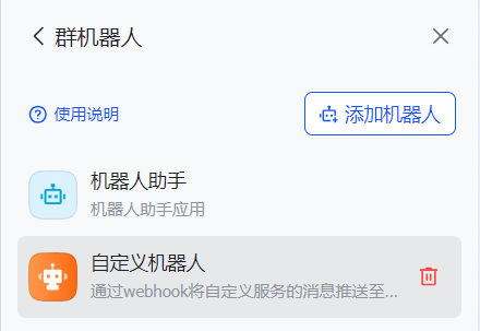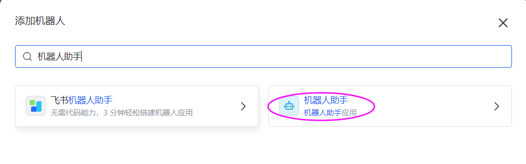 6.飞书群添加机器人,搜索“机器人助手”,选择新增的机器人助手应用;