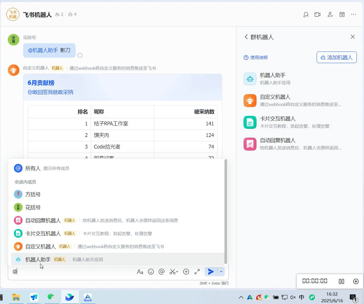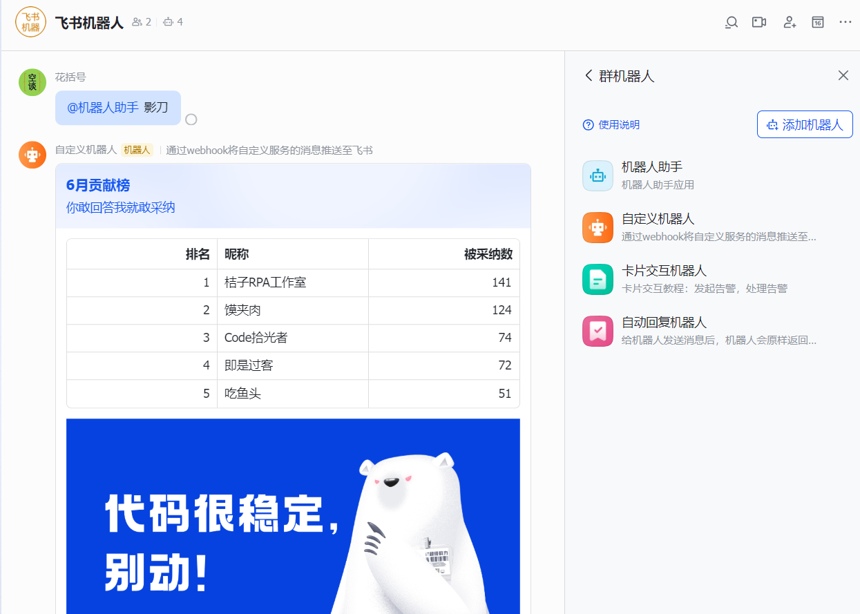 2.@机器人助手,发送“排行榜”,自定义机器人自动发送消息卡片。