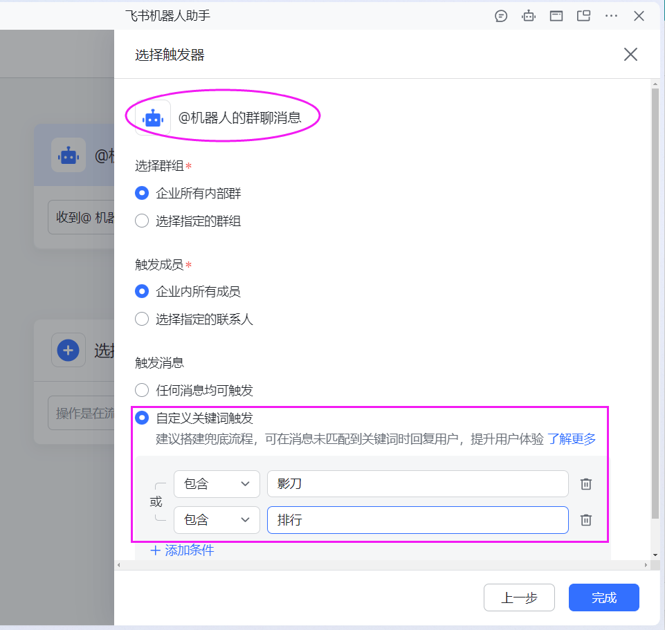 2.添加机器人助手应用,命名为“机器人助手”,触发条件选择 @机器人的群聊消息 ,触发消息选择 自定义关键词触发;