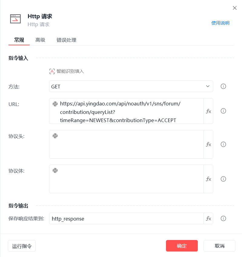 4.使用 HTTP请求 指令获取影刀问答采纳排行榜数据;
