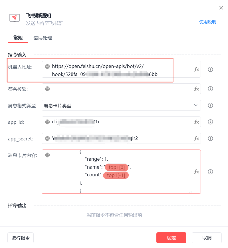 利用 飞书群消息 指令发送群消息,这里的机器人地址,只能是自定义机器人的地址,不能是机器人助手的webhook地址。