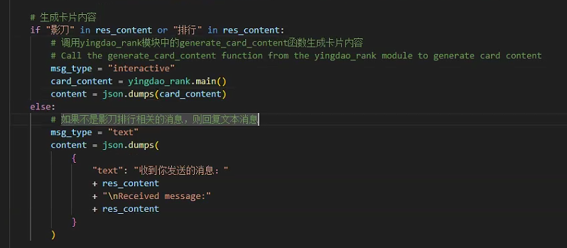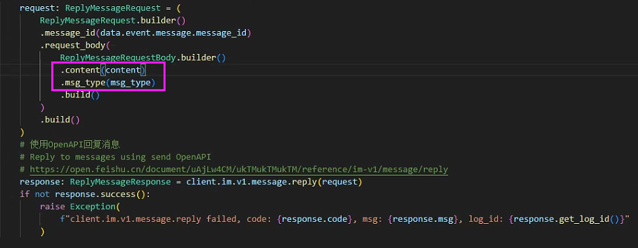 使用OpenAPI回复消息,消息内容content和类别msg_type根据发消息的内容动态取值。