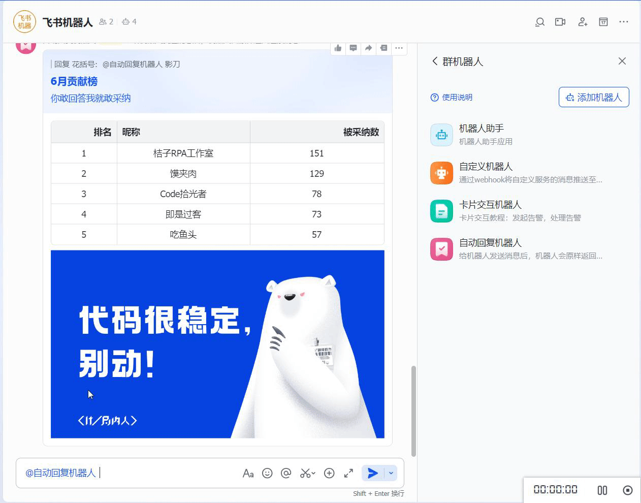 依次输入“影刀”和“排行”,都返回了飞书卡片。