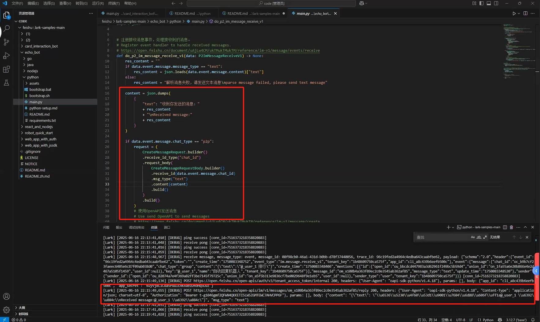 以上操作过程,通过完善SDK程序代码,完成了应用机器人自动回复飞书卡片的功能。
